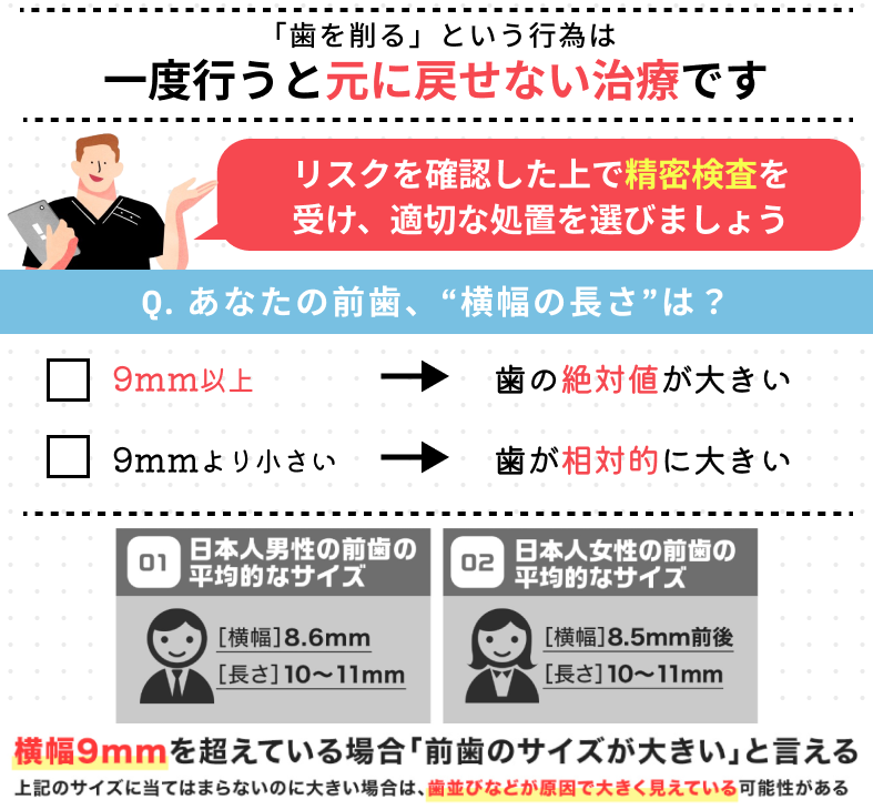- 大きく見えているケースなら歯科矯正、実際に大きいなら削ることを検討。