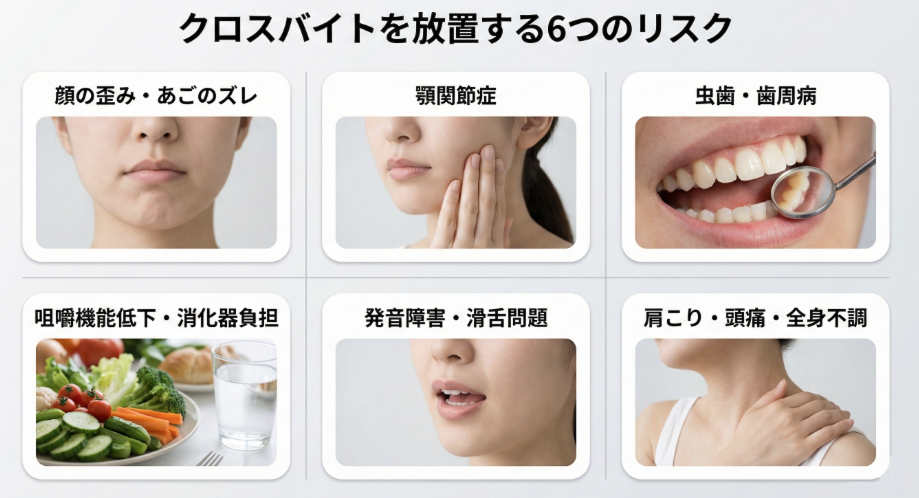 しかし、クロスバイトを放置すると、見た目だけでなく全身の健康にも影響が及ぶことがあります。治療を迷っている方は、以下のリスクを知った上で判断されることをおすすめします。