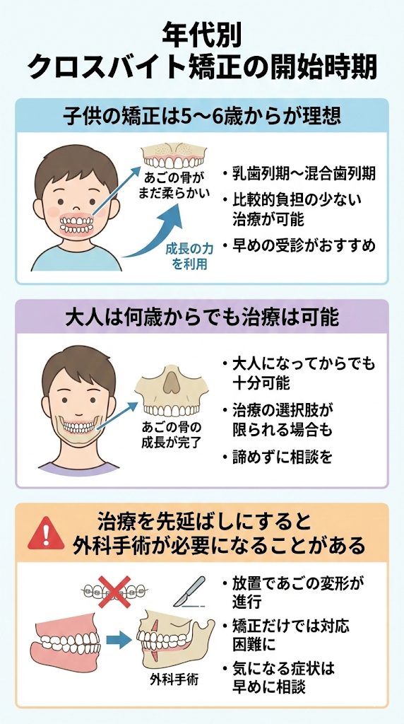 クロスバイトの治療は、年齢によってアプローチが異なります。どの時期に始めるのが良いのか、年代別に見ていきましょう。