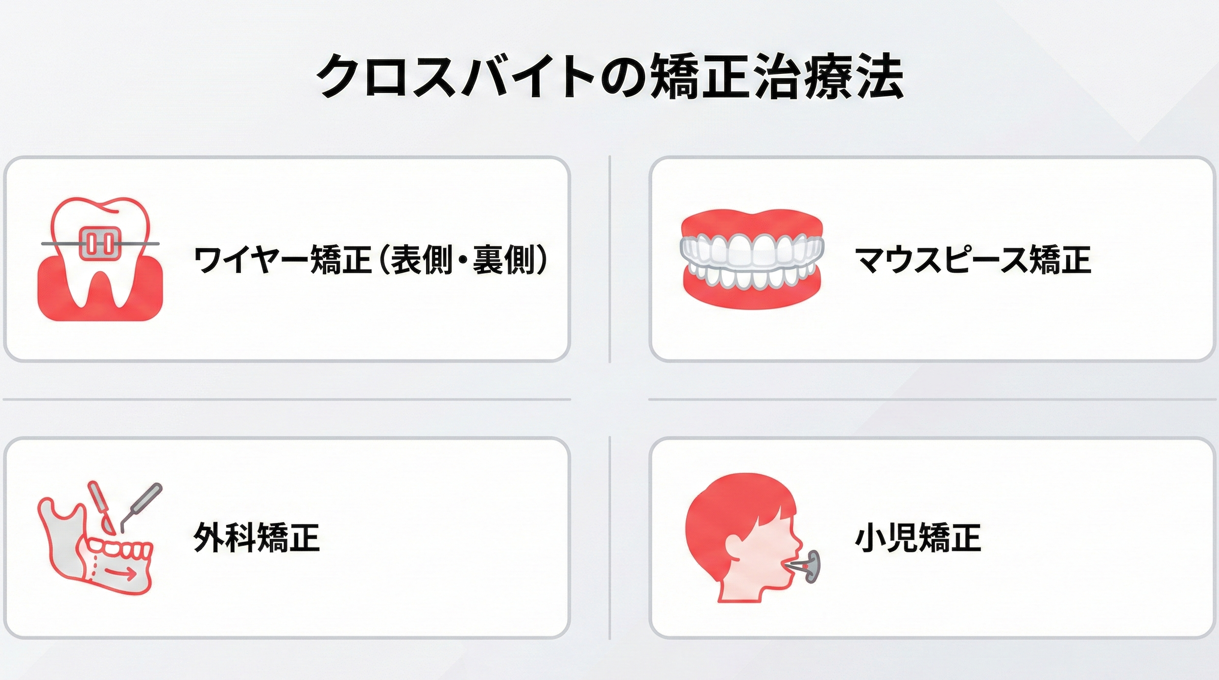 クロスバイトにはさまざまな治療法があり、症状の程度や年齢、ライフスタイルに応じて適した方法を選択できます。