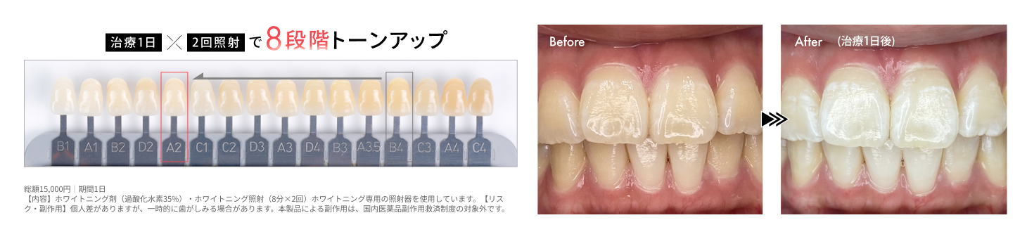 - 施術内容:ホワイトニング剤(過酸化水素35%)・ホワイトニング照射(8分×2回)ホワイトニング専用の照射機を使用しています。