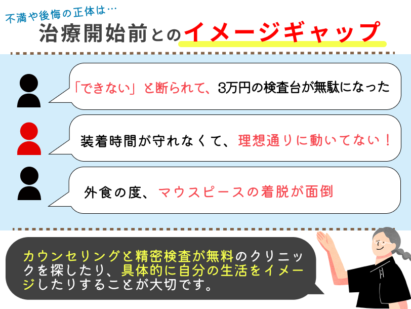 自己判断でマウスピースを進めてしまう方も失敗しやすいです。装着するマウスピースは、必ずクリニックや歯科医師の判断に従ってください。