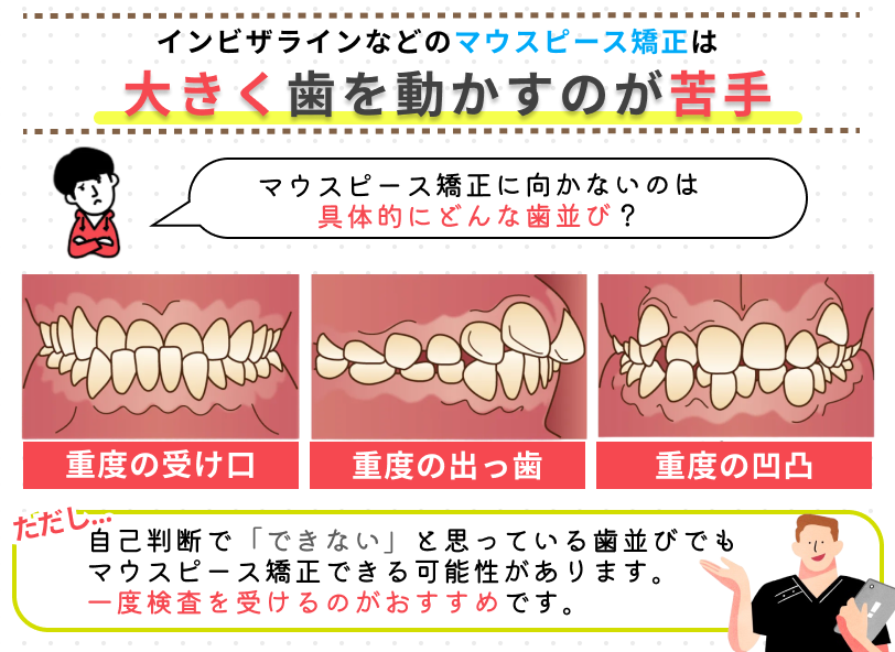インビザラインは幅広い症例に対応できる矯正方法ですが、歯並びや口の状態によっては適さないケースもあります。