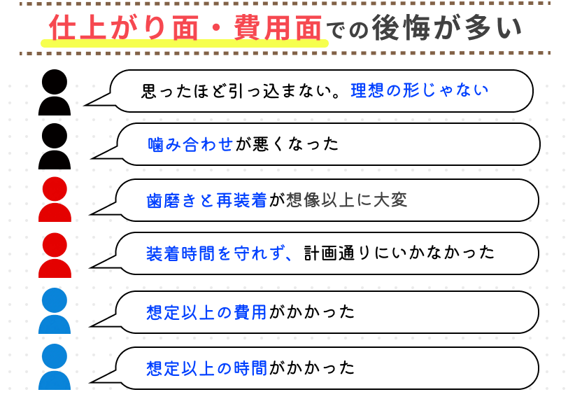 「装着時間を守れなかった」「ゴムかけをサボってしまった」「後戻りして追加作製が必要になった」など、自己管理の難しさから後悔するケースもあります。