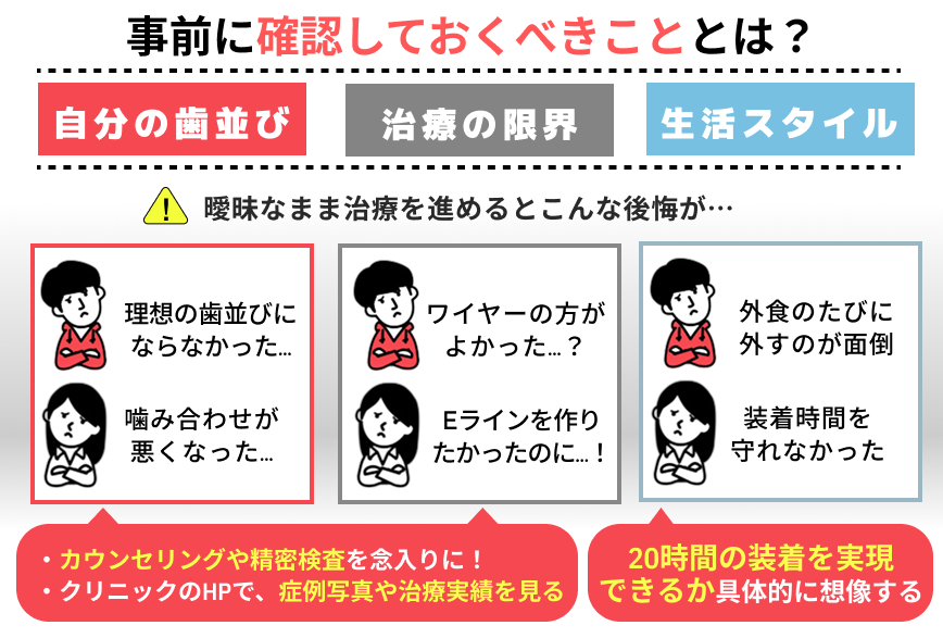 - インビザラインで後悔する人の共通点は「事前の確認不足」。
