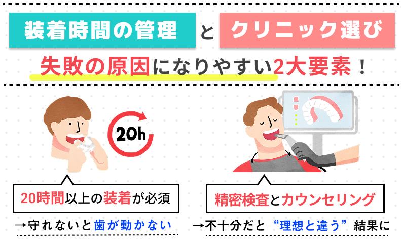 特に多いのが、装着時間の自己管理が難しい人と、クリニック選びを急いで十分な説明を受けないまま契約してしまう人です。