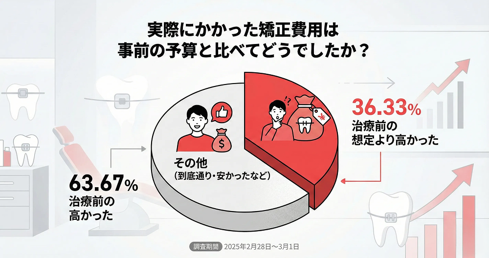 実際、矯正経験者300名への調査では、約36%の人が「当初の想定より総額が高くなった」と回答しています。