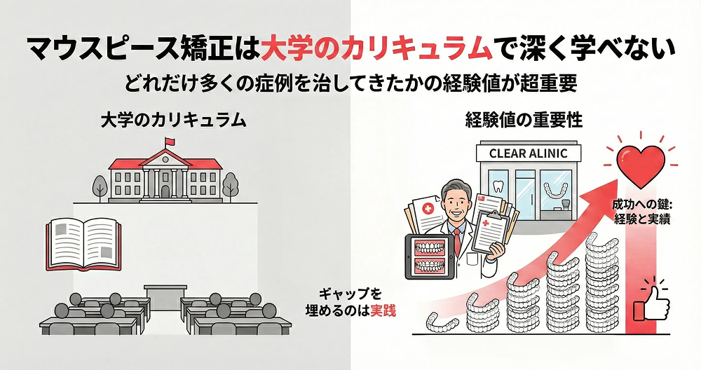 特にマウスピース矯正は、大学の教育課程では深く扱われない領域であるため、医師の「個人の経験値」が仕上がりを180度左右します。