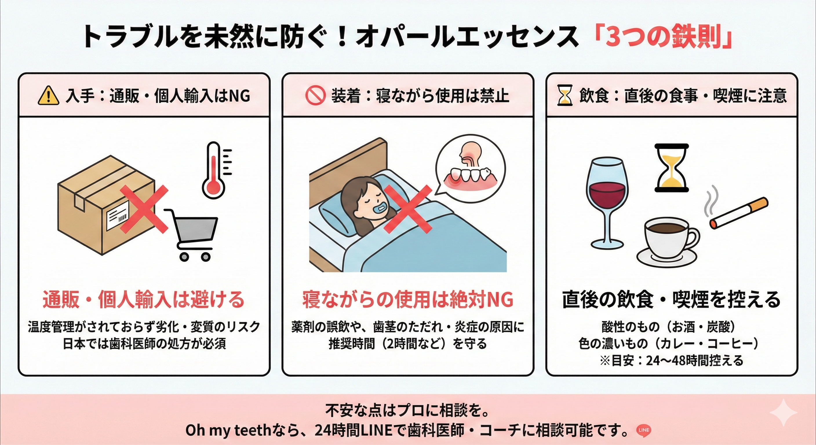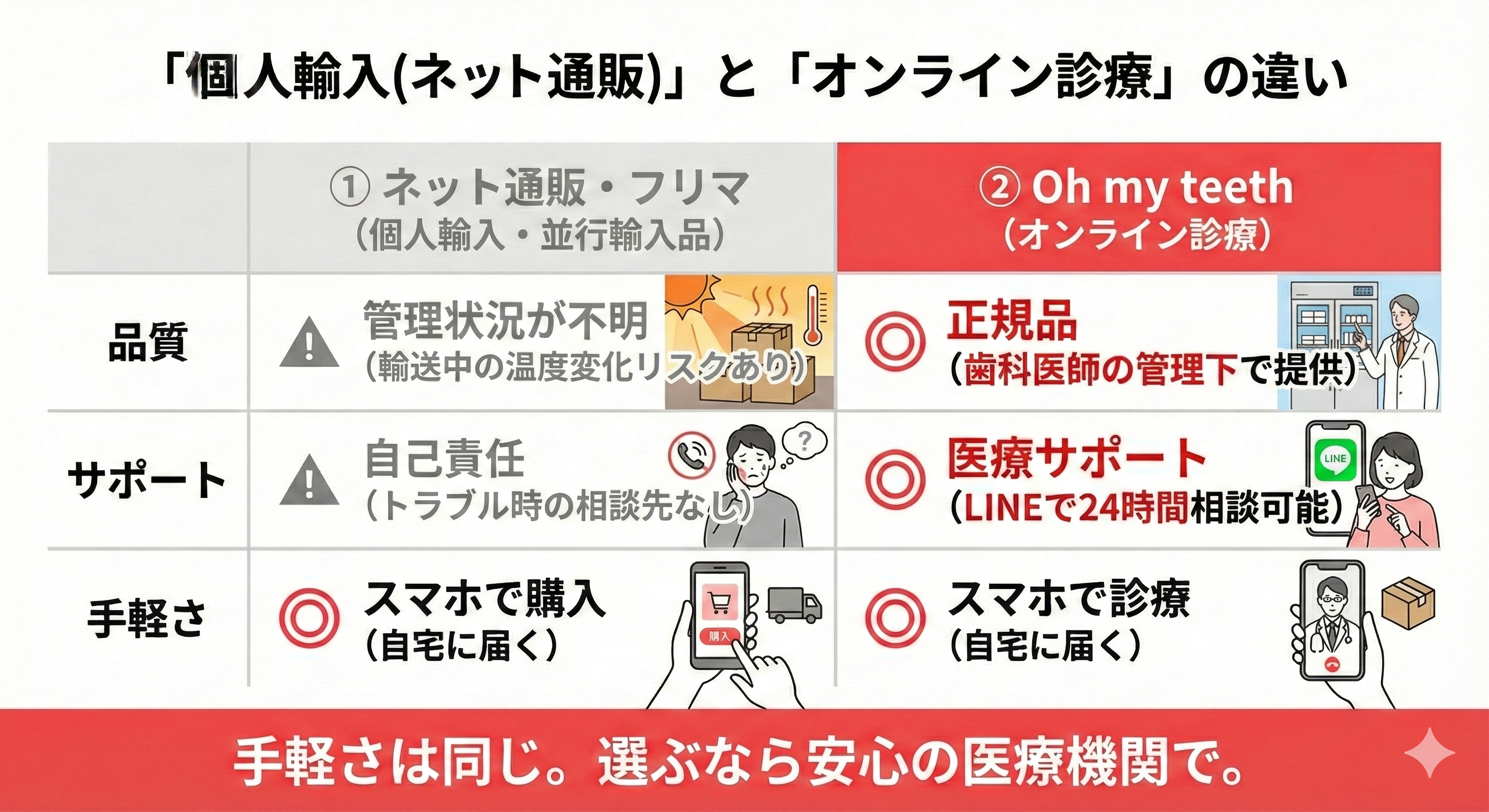 リスクを冒してまで、通販サイト(個人輸入)で探す必要はもうありません。 Oh my teeth 導入クリニックなら、「オンライン診療(ホーム)」と「クリニック施術(オフィス)」の両方で、歯科医師管理下の正規品を提供しています。