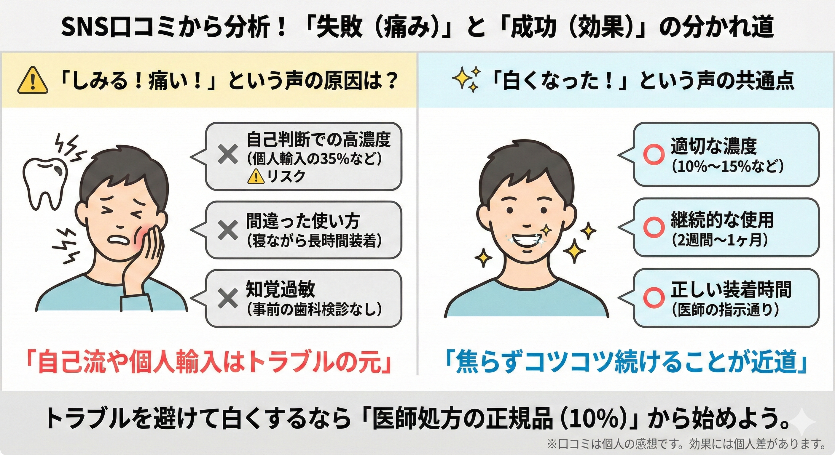 結論から言うと、「自宅で手軽に維持したい」ならホーム用、「短期間で一気に白くしたい」ならクリニック用(Boost)を選ぶのがよいでしょう。