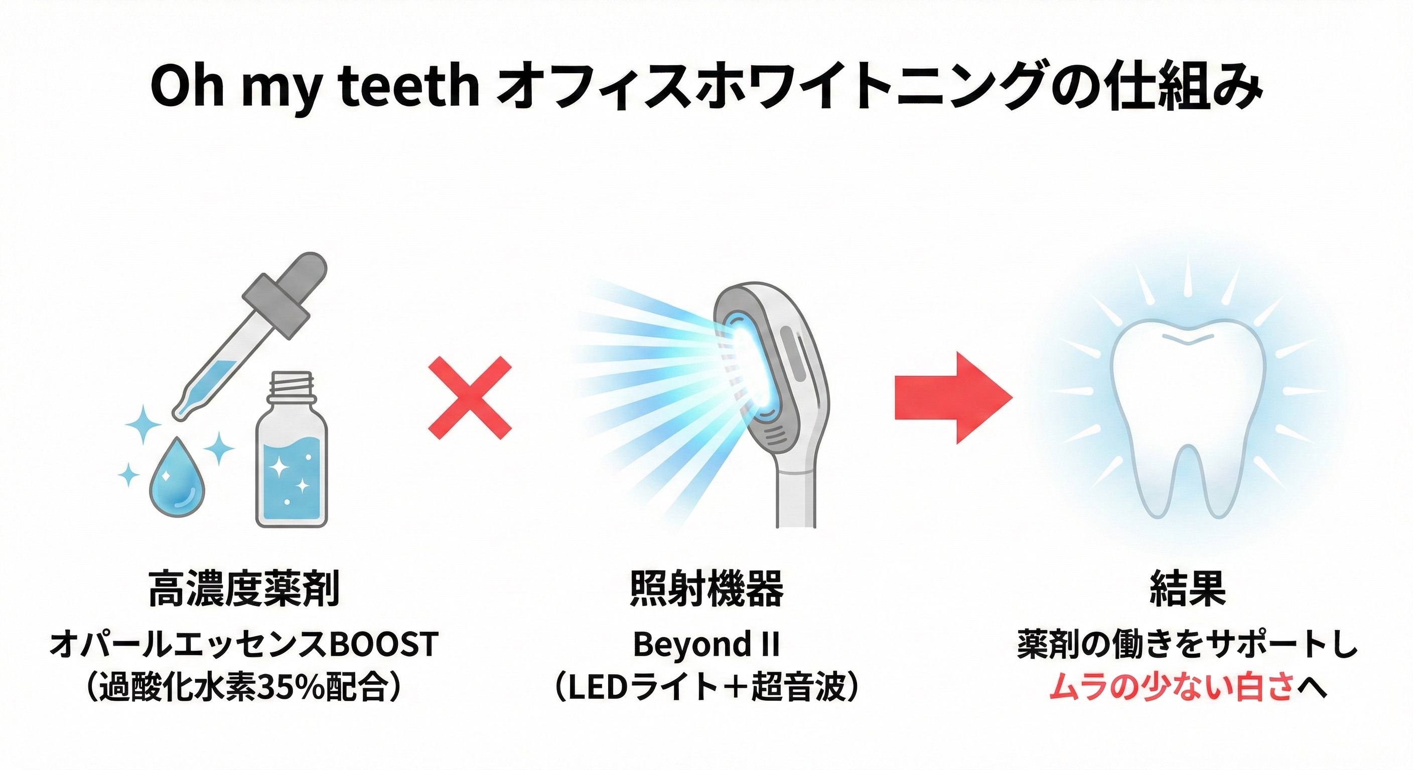Oh my teethのオフィスホワイトニング(薬剤グレードアッププラン)は、オパールエッセンスBOOSTの効果を、さらに引き出すために設計されています。