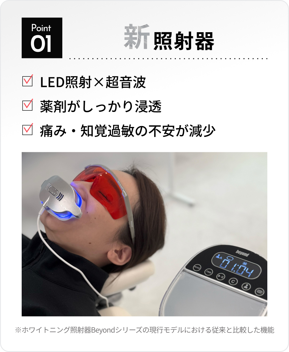 目標の白さに合わせて薬剤・照射回数の調整ができるため、ご安心ください。