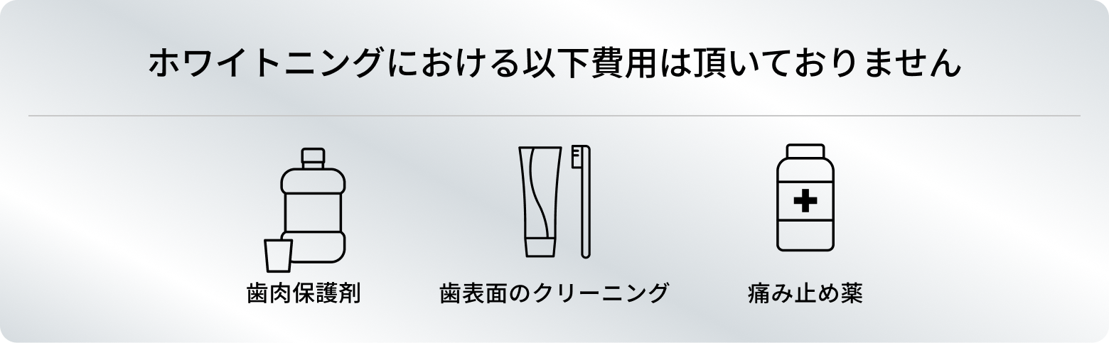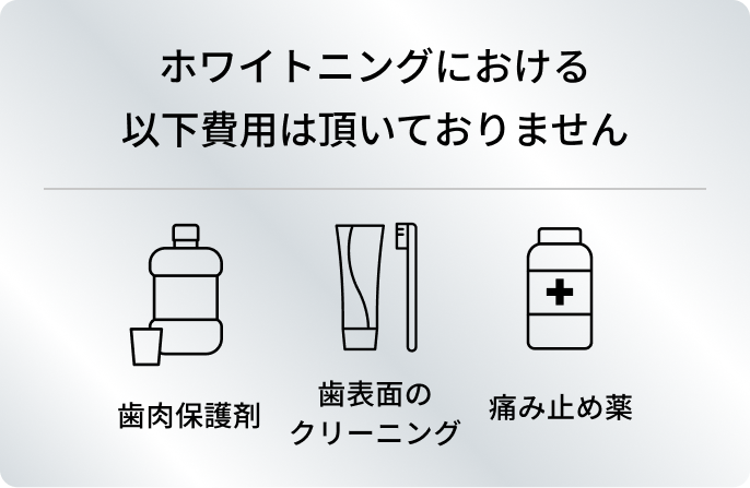 まれに痛みの出る方もいますが、痛みのない方がほとんどです。施術中や施術後に、痛みやしみる感覚が生じる場合がありますが、一時的な症状です。知覚過敏などによって痛みが出やすい方は、シミ止めのお薬を塗布することも可能です。